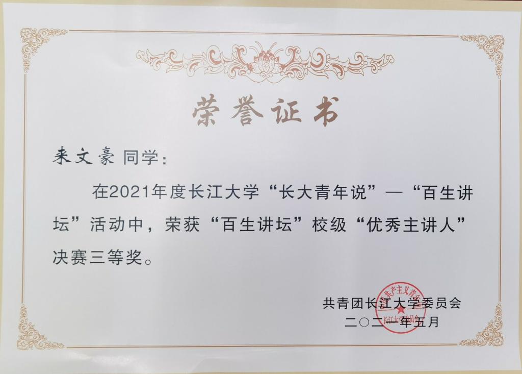 为庆祝中国共产党成立100周年,进一步推进习近平新时代中国特色社会主义思想进支部、进社团、进网络、进团课,2021年5月13日下午,百生讲坛”优秀主讲人决赛暨示范巡讲在必赢3003no1线路检测中心东校区12教405拉开帷幕,必赢官网来文豪荣同学获校级“优秀主讲人”决赛三等奖。