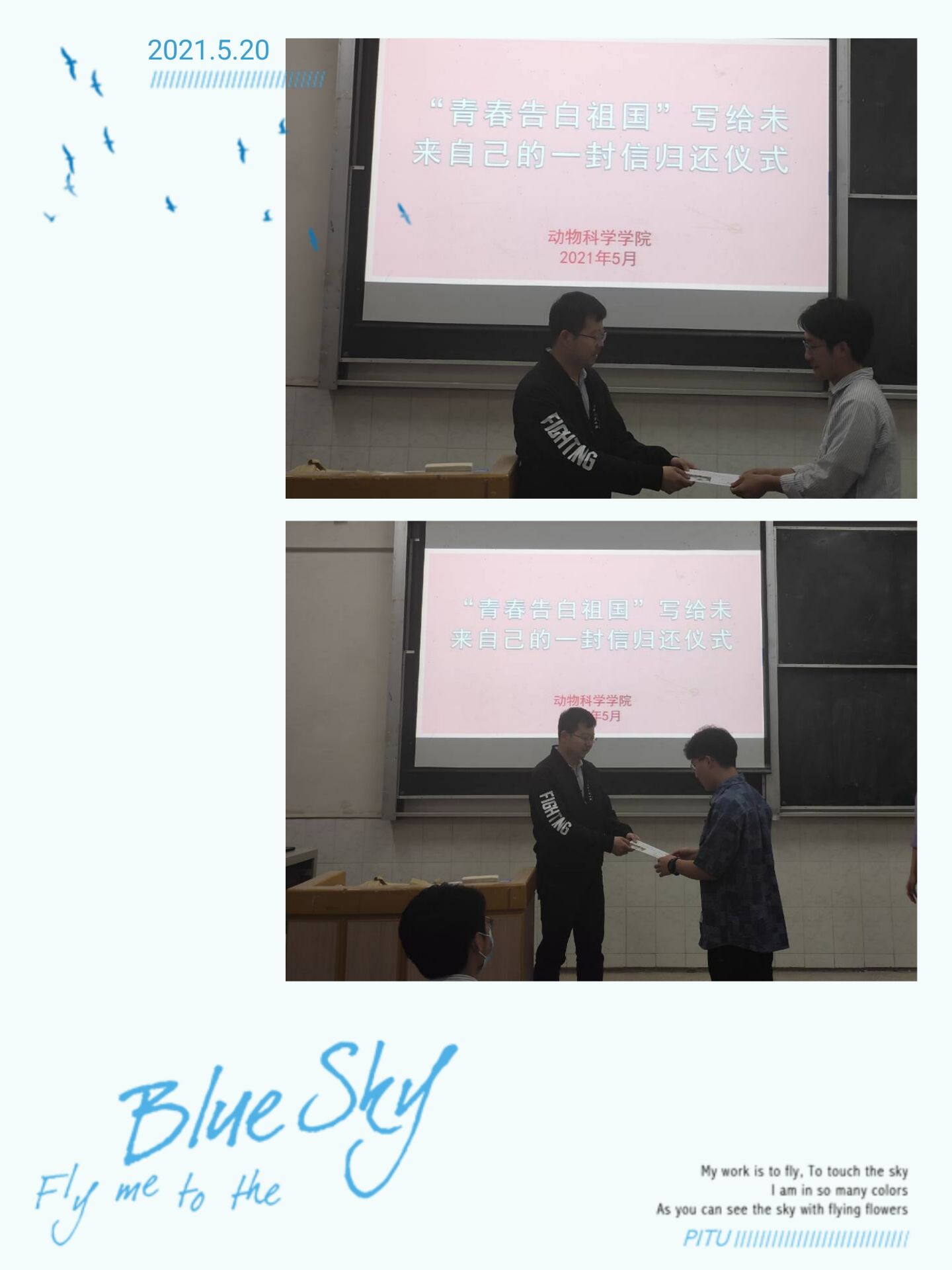 2021年5月20日晚18:00,动科学院学院在5教115教室开展了“青春告白祖国—写给自己的一封信”归还仪式。致未来的自己书信撰写活动。辅导员陆波老师、李灿阳老师和2019级全体本科生参加了活动。