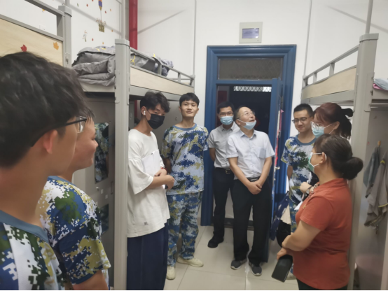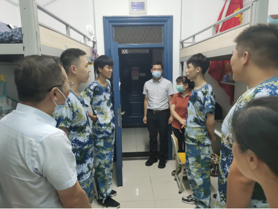 领导与老师们逐一走访了各新生宿舍,重点强调安全问题,特别提醒禁止使用大功率电器,以增强新生的安全防范意识。在检查宿舍卫生的同时,领导和老师们暖心询问了新生的心理和身体健康状况,以及刚进大学的感想和期待,对于新生所提出的困惑进行了详尽地解答,并嘱咐新生们每天按时进行体温监测和打卡,有身体不适的情况要立即上报辅导员,且对新生未来的大学生活表达了希冀,希望同学们珍惜大学校园学习时光,坚持以学业为主,全方面发展自己的能力。同时,领导老师们针对当下刚入学的情况希望同学们及时调整心态,无需过度紧张和迷茫,减轻了新生对于新阶段的成长压力,鼓励新生在军训中要乐于表达自己并积极融入到集体当中,与其他同学互帮互助,以积极进取的姿态迎接全新的大学校园生活。