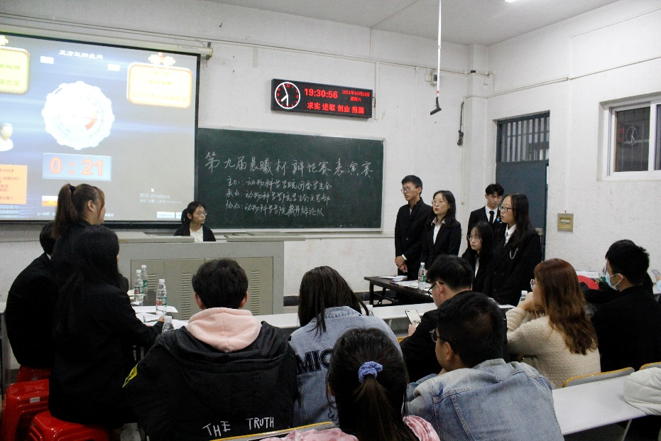 本次表演赛的辩题是“大学生应不应该谈恋爱”,正方是由位爽、周华骏、李佳桐、范海璐组成的“拒绝emo、恋爱超甜”队,反方“学习真香队”则由江哲 、毕若暄、丁若彤、郭歌为代表。